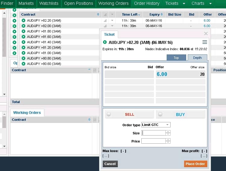 Market orders and Limit orders are available, but no Take Profit or Stop Loss. Nonetheless, you can get out of your trades early. You can do this by setting up an opposing order. Imagine you have an open “buy” contract and you want to take profit or halt your losses. You can click on the open contract, and Nadex will automatically pull up a second ticket window. This ticket will allow you to swiftly place an opposing sell order. Place the order and wait. Unfortunately there is no guarantee that you will get out of the trade. The system needs to find someone to take the other side. If someone does, you will be released. Otherwise, you will have to wait for the trade to expire.